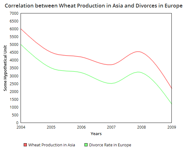 For eg. You could have a graph showing relation between wheat production in Asia and Divorce rate in Europe from 2004 to 2009, but we can be certain to some extent in this case that no matter how much closely related these lines are, there is very little chance for wheat production to affect the divorce rate in Europe. Since there is always some remote chance for two completely unrelated quantities to be correlated, this might be confusing if we don't understand causality.